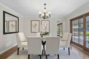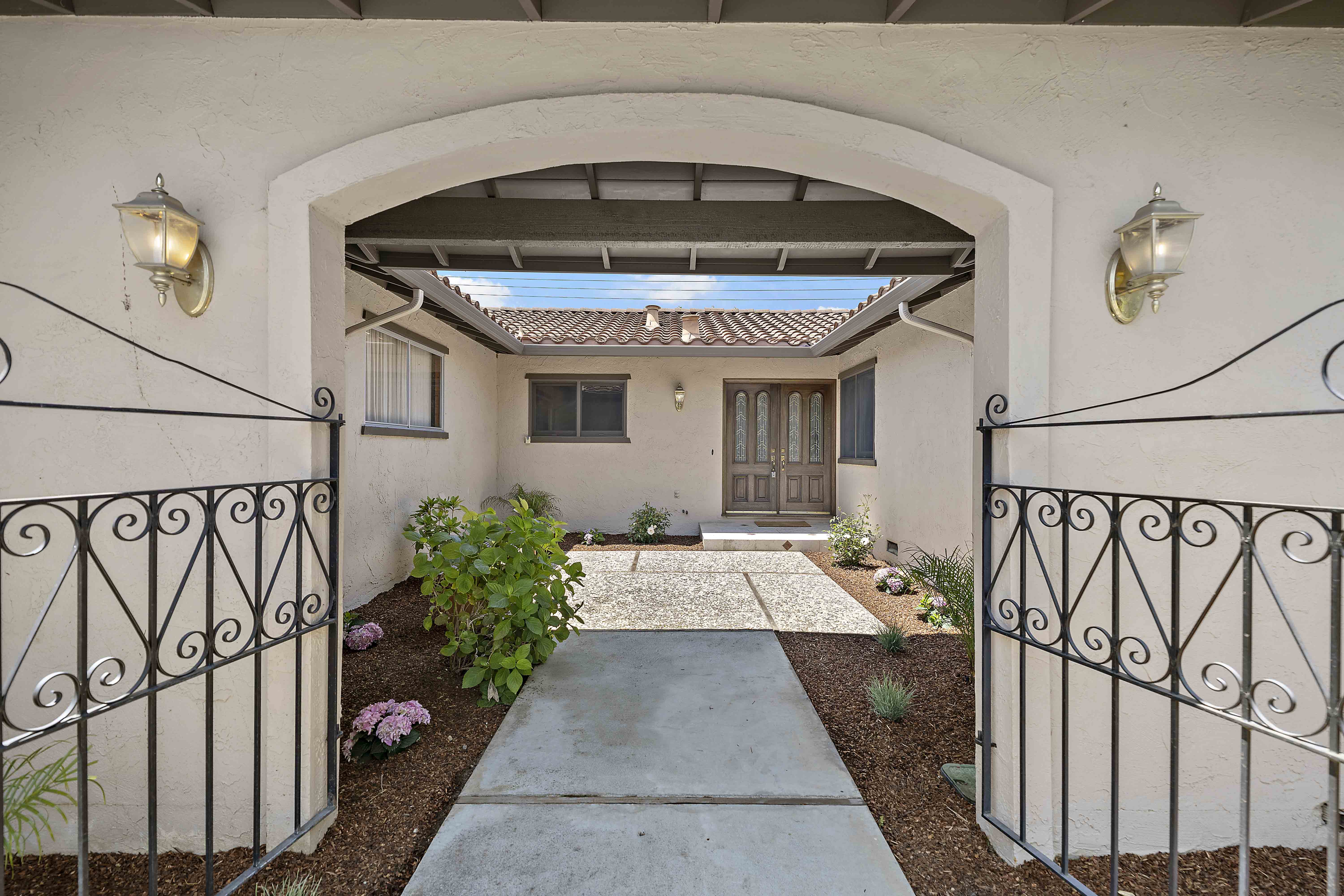 Step through the grand, courtyard entrance into a light-filled living space, where expansive windows frame picturesque views of lush gardens. The open floor plan seamlessly connects sophisticated living and dining areas, ideal for elegant entertaining or quiet relaxation. Outside, a private sanctuary awaits.