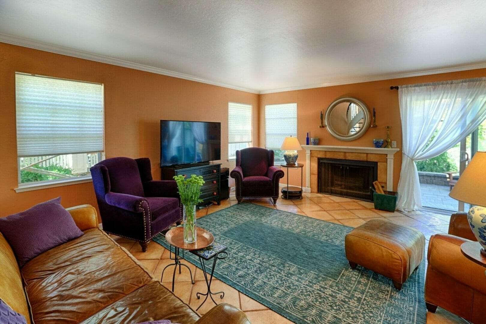 - Entertainers living room with fireplace and doors that open to private patio and yard