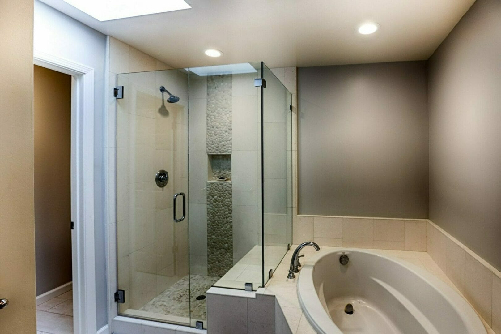 - Nearly new master bathroom includes double vanities, separate tub and shower with stone and tile finish, walk in closet, and a sky light