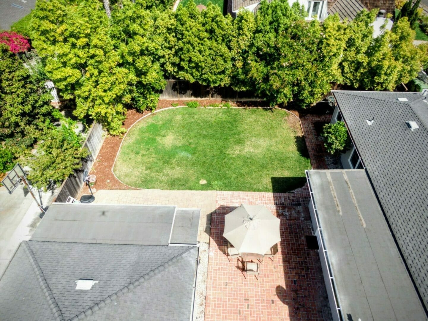 Entertainers backyard with bright, sunny patio