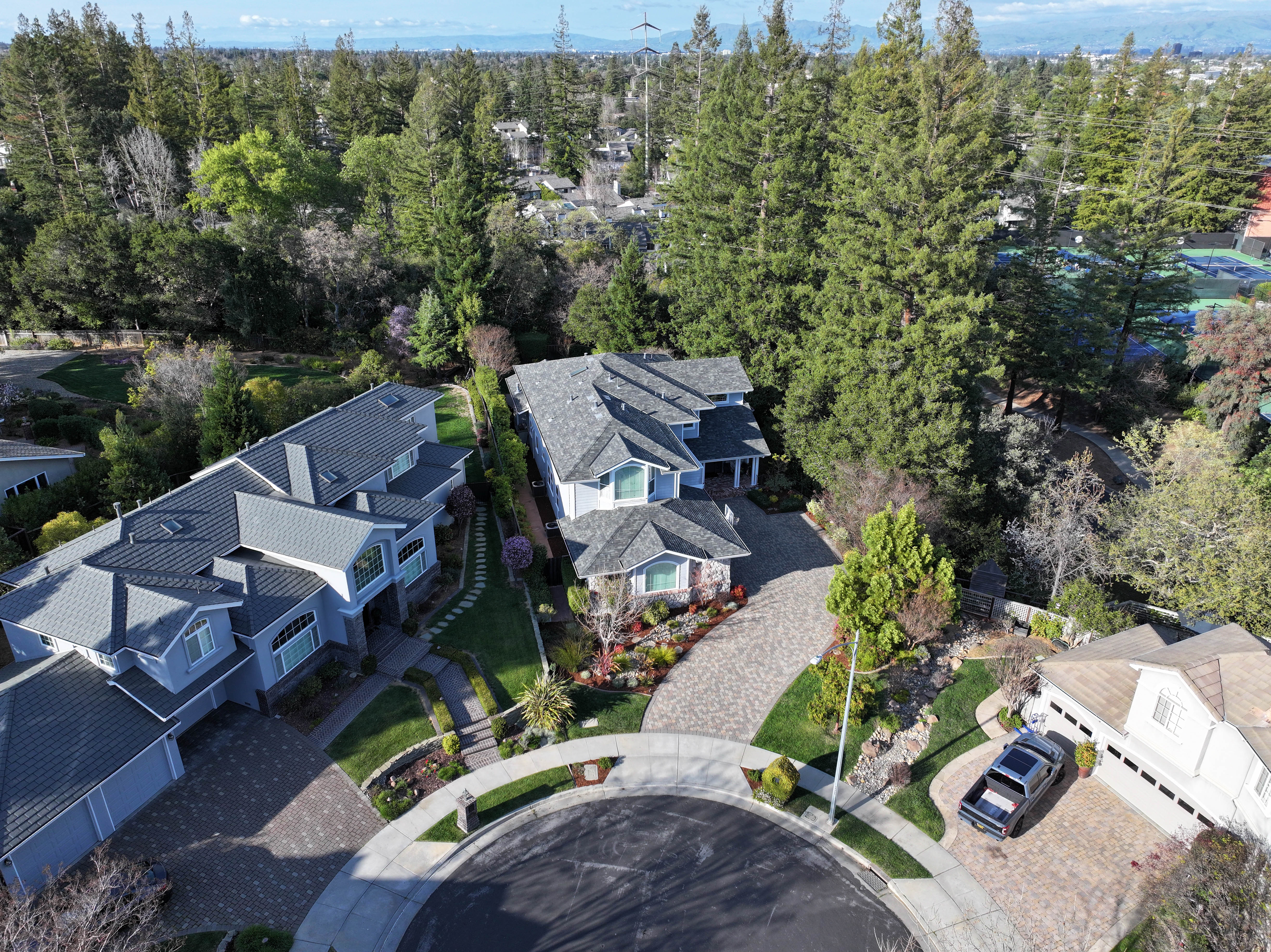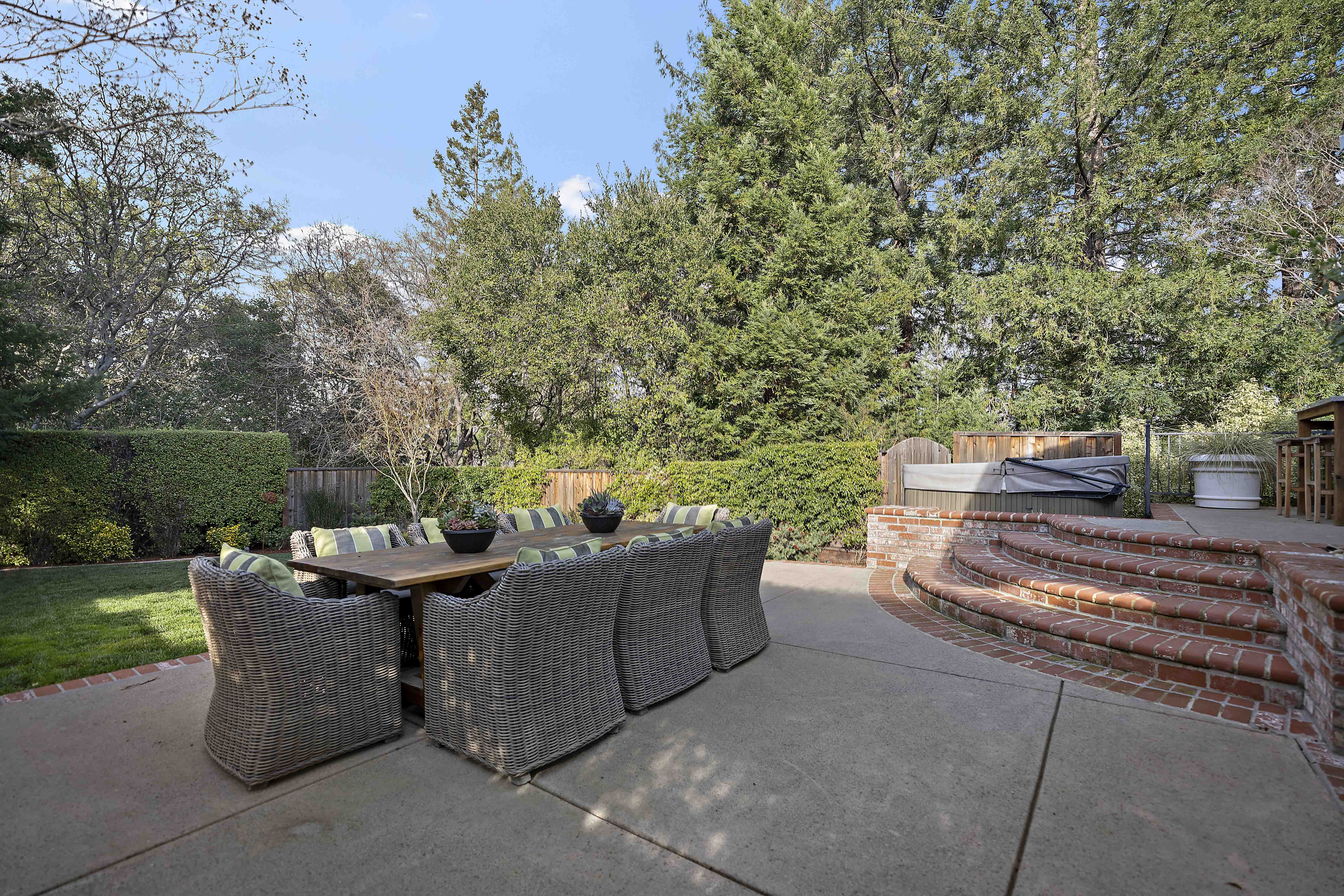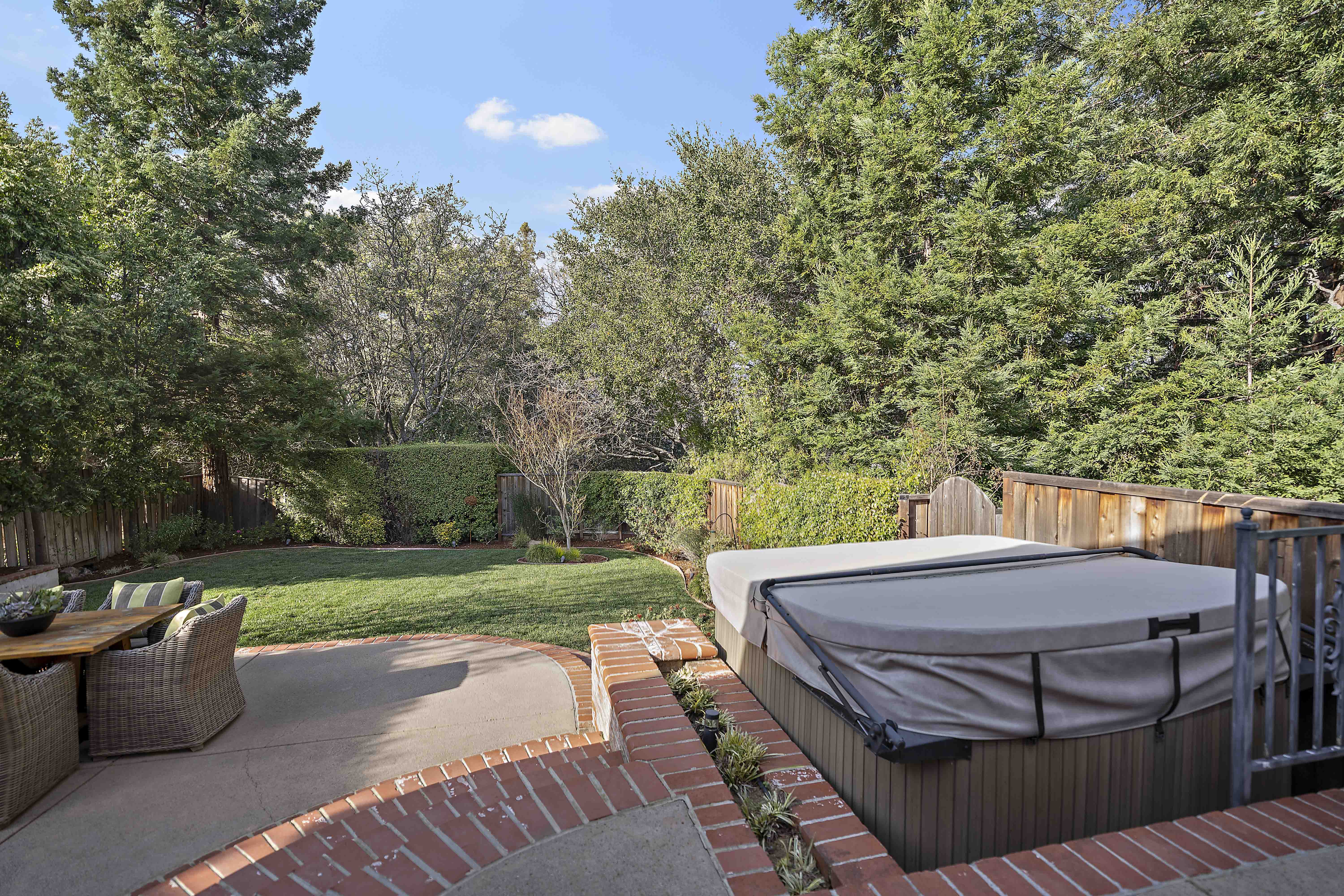 The expansive 13,800-square-foot lot offers a serene and private outdoor space, featuring lush professional landscaping, oak and redwood trees, and a spacious patio ideal for al fresco dining and relaxation. The peaceful cul-de-sac provides a safe, traffic-free environment for kids to play, and the friendly neighborhood hosts social events like progressive dinners and cookouts.